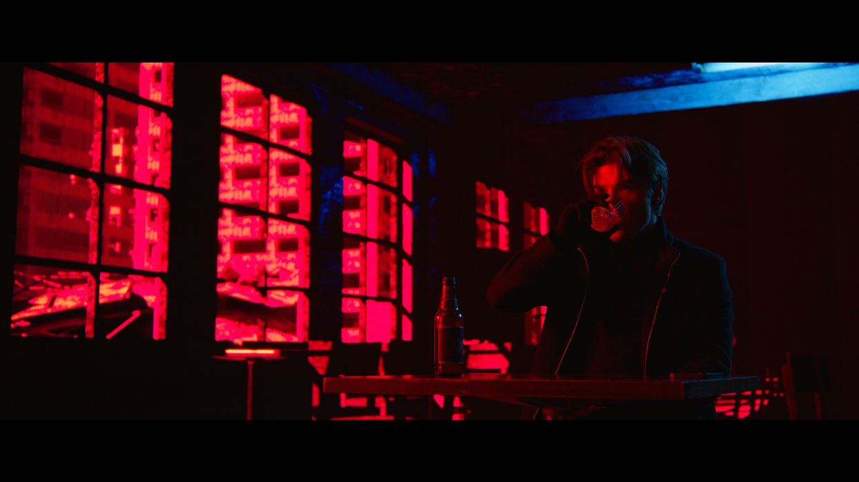 In the aftermath of devastation, a man sits alone in the ruins of a bar. He pours himself a drink, gazing out at a world reduced to ash and rubble. As a countdown appears on a device in his hand, he steps through a broken wall, smiling as missiles land in the distance, and a wave of fire races toward him.